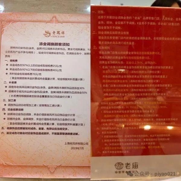 老庙黄金的规则与之类似:自有品牌更换,须添金20%以上,非自有品牌须添金40%以上;不收熔炼费,但按品牌收每克10元至12元的服务费,以及旧首饰的换新重量要扣除1%损耗。